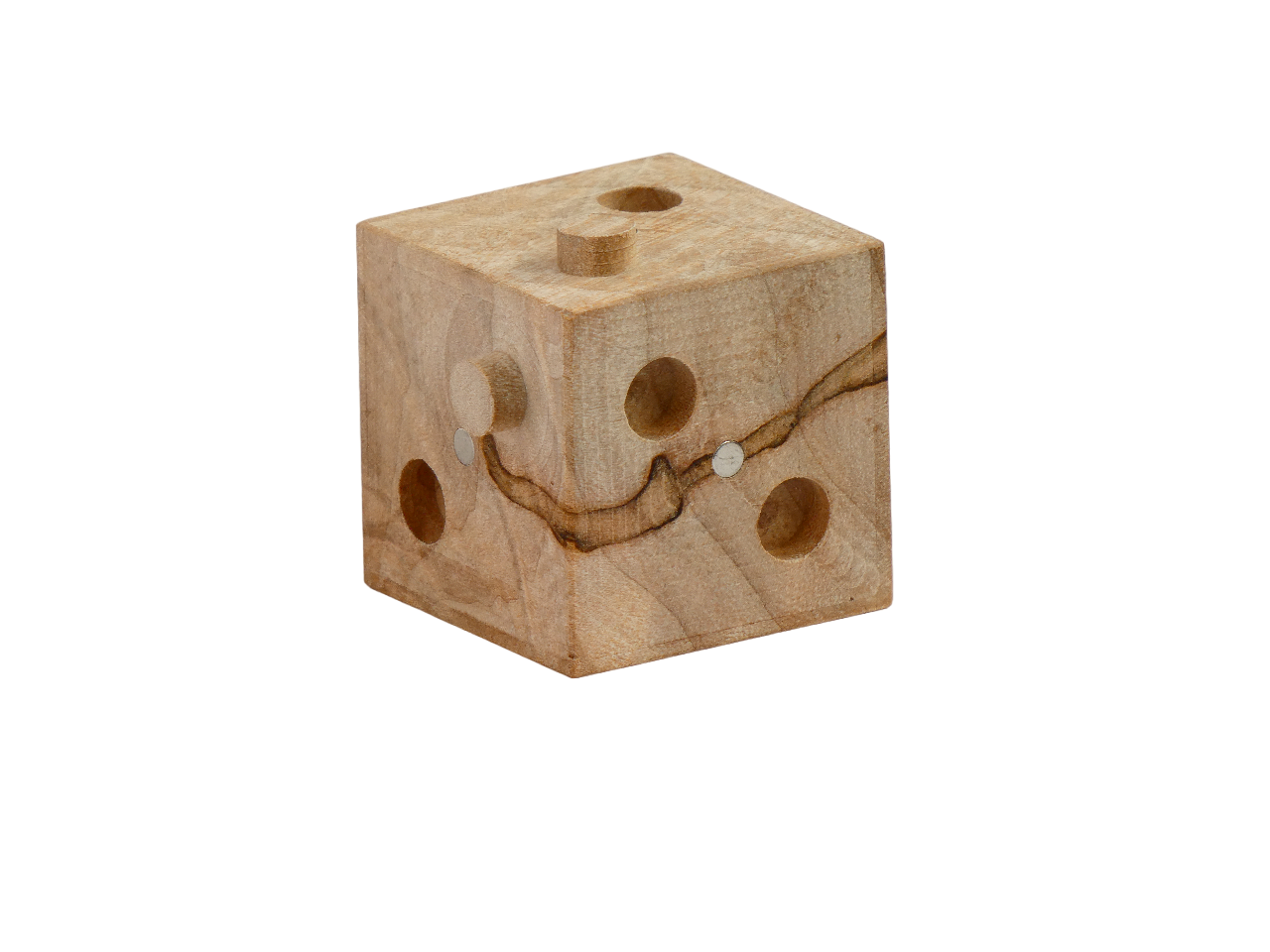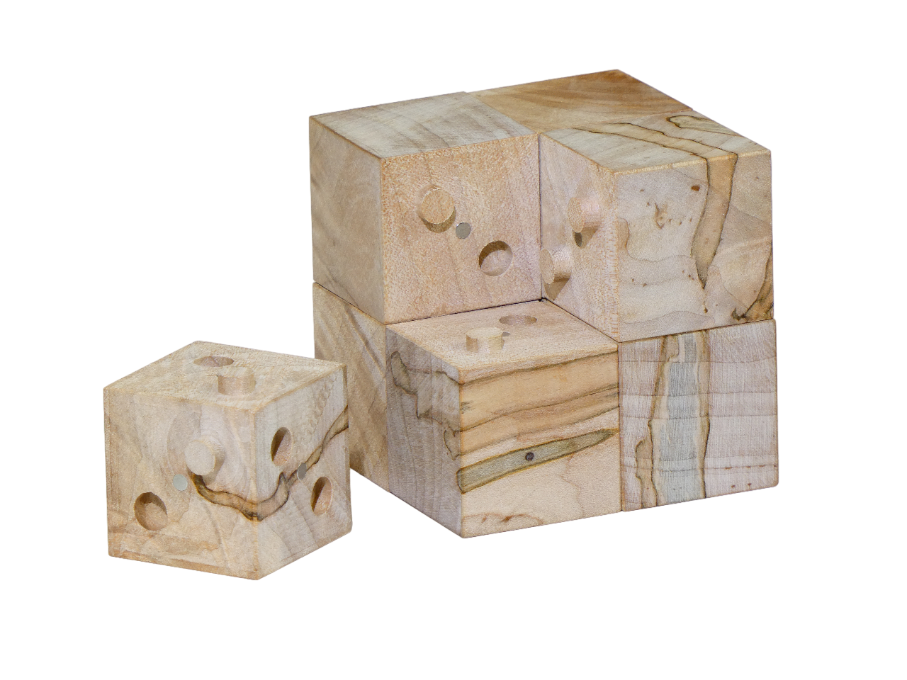 Eight cubes combine into one larger cube, snapping together with magnets in a satisfying way. Beautiful design with great fidgeting potential. Made of Ambrosia Maple, each copy has a unique spalting pattern. All parts are carved from single pieces of wood without glue or joinery.